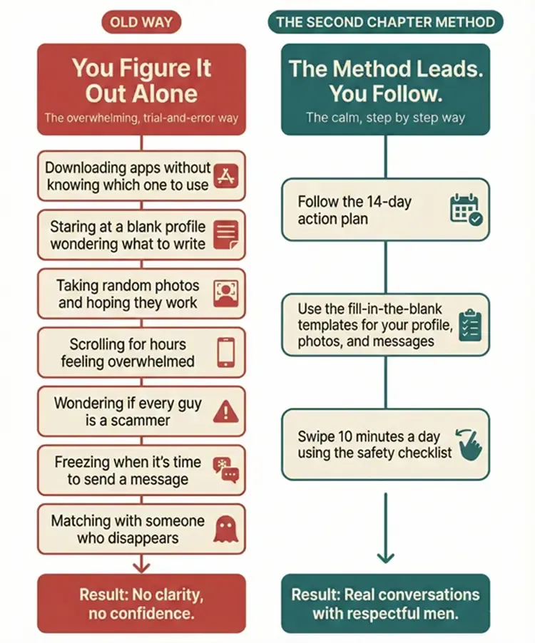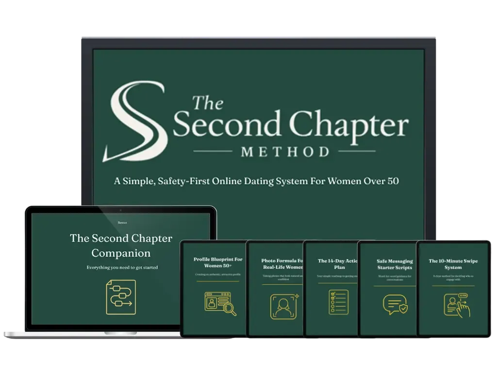 The Second Chapter Method is a step-by-step system that helps women over 50 use dating apps with calm confidence.